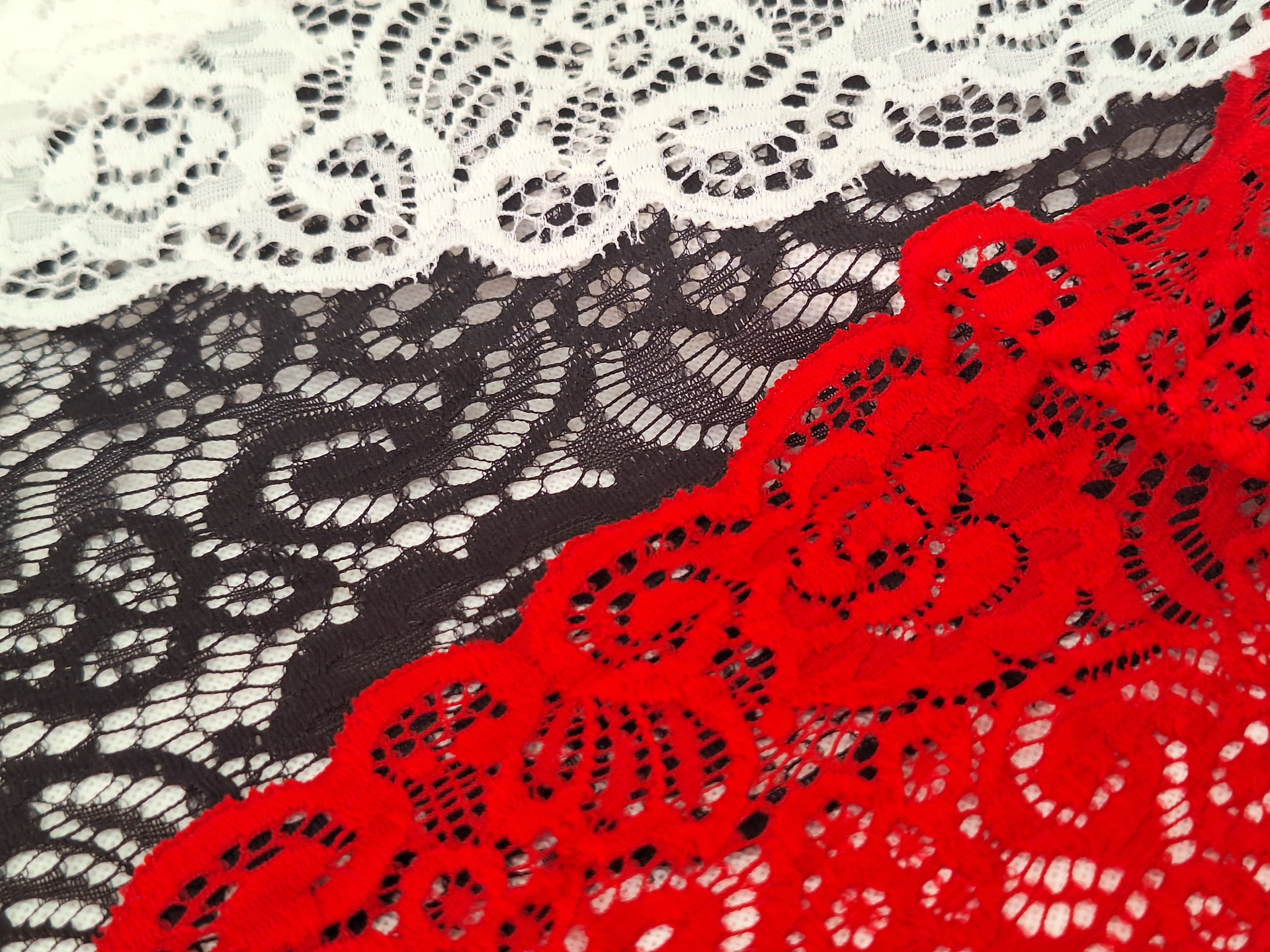 Encajes de blonda de colores. Ideal para prendas elásticas o lenceras, ensanchar vestidos y faldas ceñidas, etc.