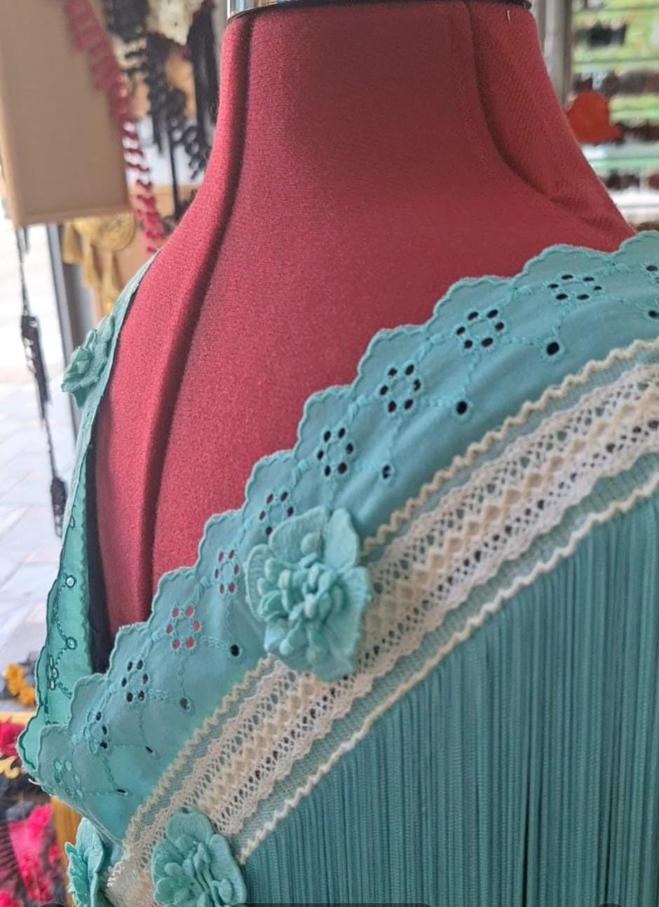 Mantoncillo confeccionado ó Kit Mantoncillo flamenco con entredos tul bordado y flecos cuquillo( materiales para montar tu mantón flamenco) 1,60 metros encaje – 1,60 metros tirabordada- 1,60 metros flecos cuquillo – 65cm metros fflores guipur